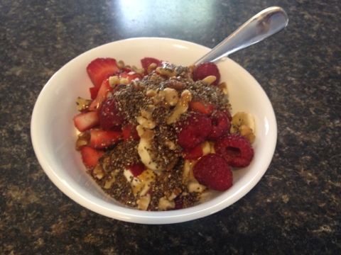 I started the day with coffee and my usual breakfast of Greek yogurt, fruit, agave, nuts, and chia.