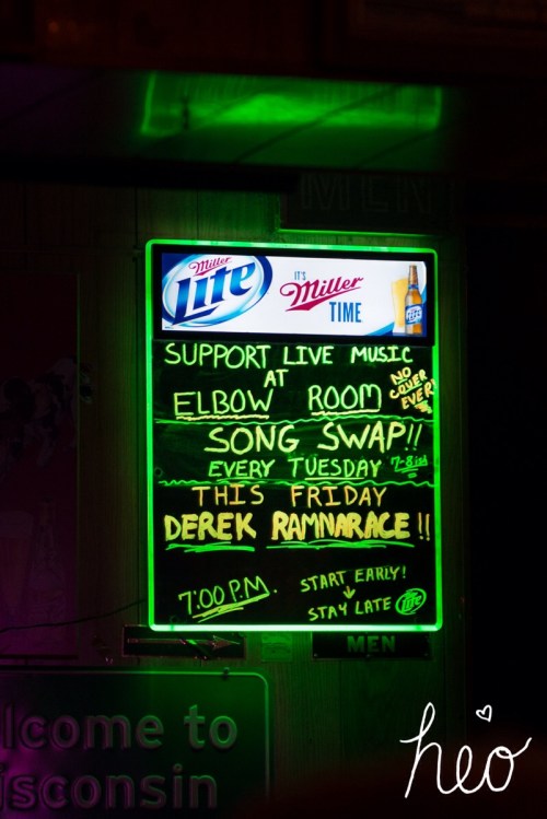 Elbow Room is a classic Wisconsin hometown bar, found tucked in the corner downtown on the square. Their motto is, “No Fancy Drinks!” and they are a big supporter of live music. The bartender is the creator of the world’s largest trivia contest, and there are always interesting people there to talk to. Thanks for inviting me over!