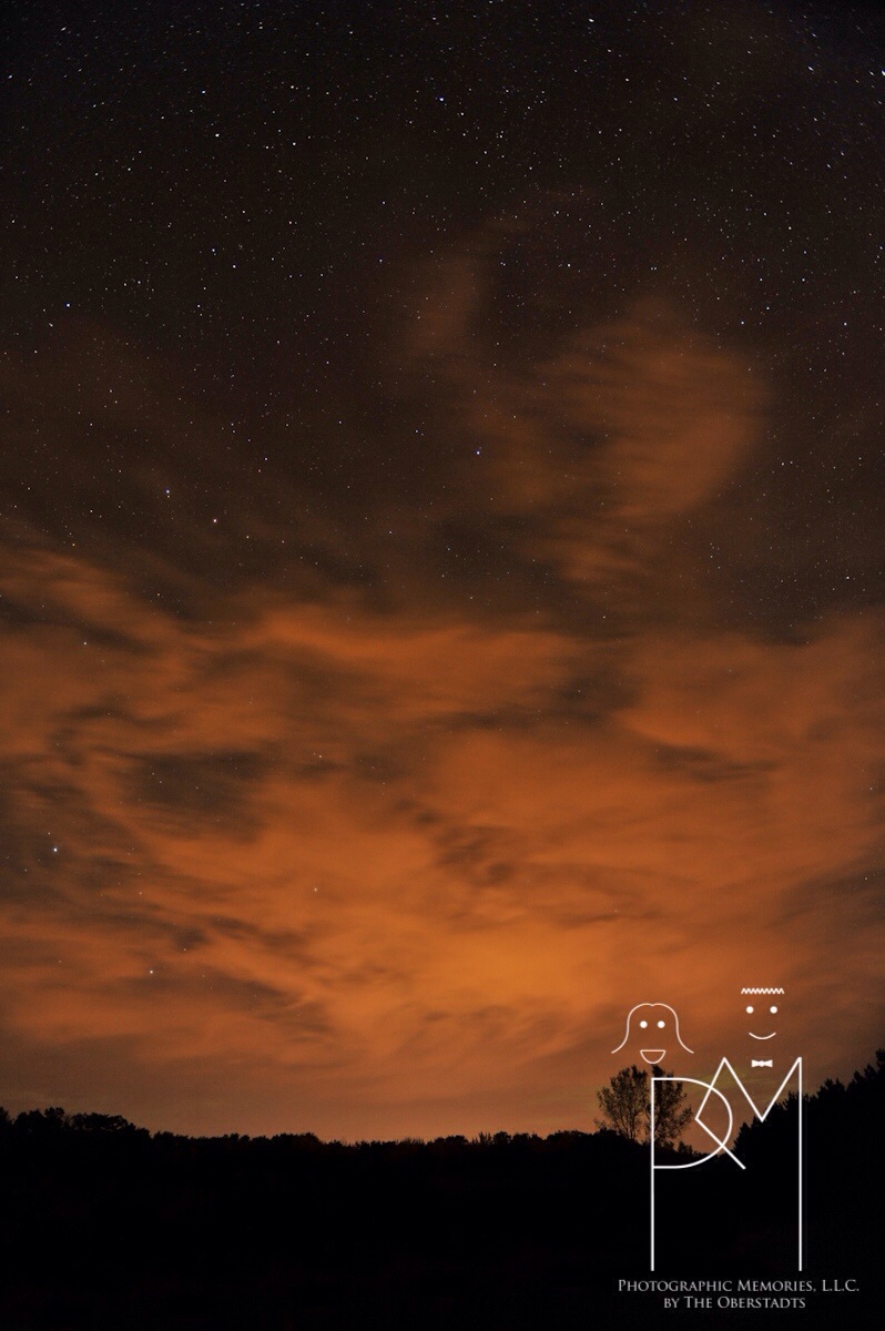 My first stop was a short drive away, at Sunset Lake. When I got there, I wondered if the park was closed, since it was dark. I hoped not, since the gate was open, and I drove down to the water’s edge. I pulled out my tripod, and my camera, and the bug spray, then got set up. My eyes had finally adjusted to that extra-black-feeling darkness of playing in the country late at night, when a boat showed up. They were fishing with a giant light in their boat, and I knew it would be hard to work around their light as I was setting my exposure to the skies… and just when I thought I better shoot fast before they entered my frame, they shone their light right at me on shore, and I could no longer see anything. 😦 It’s a good thing that I know my gear like the back of my hand, so I could operate it without actually looking at the buttons and dials.